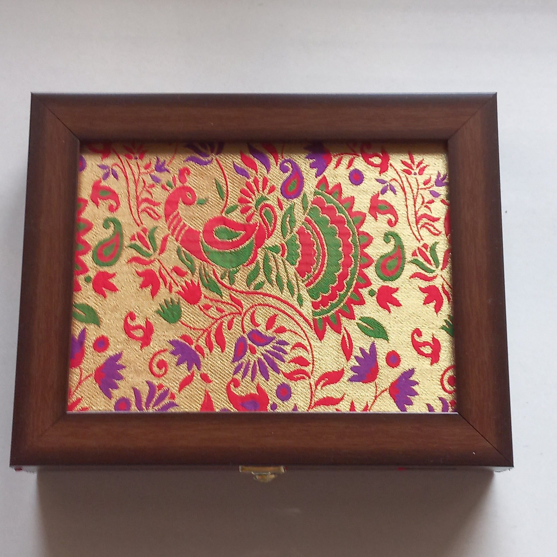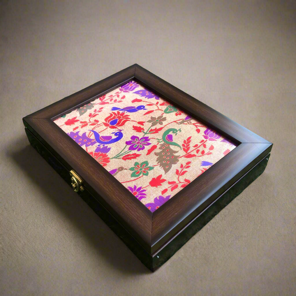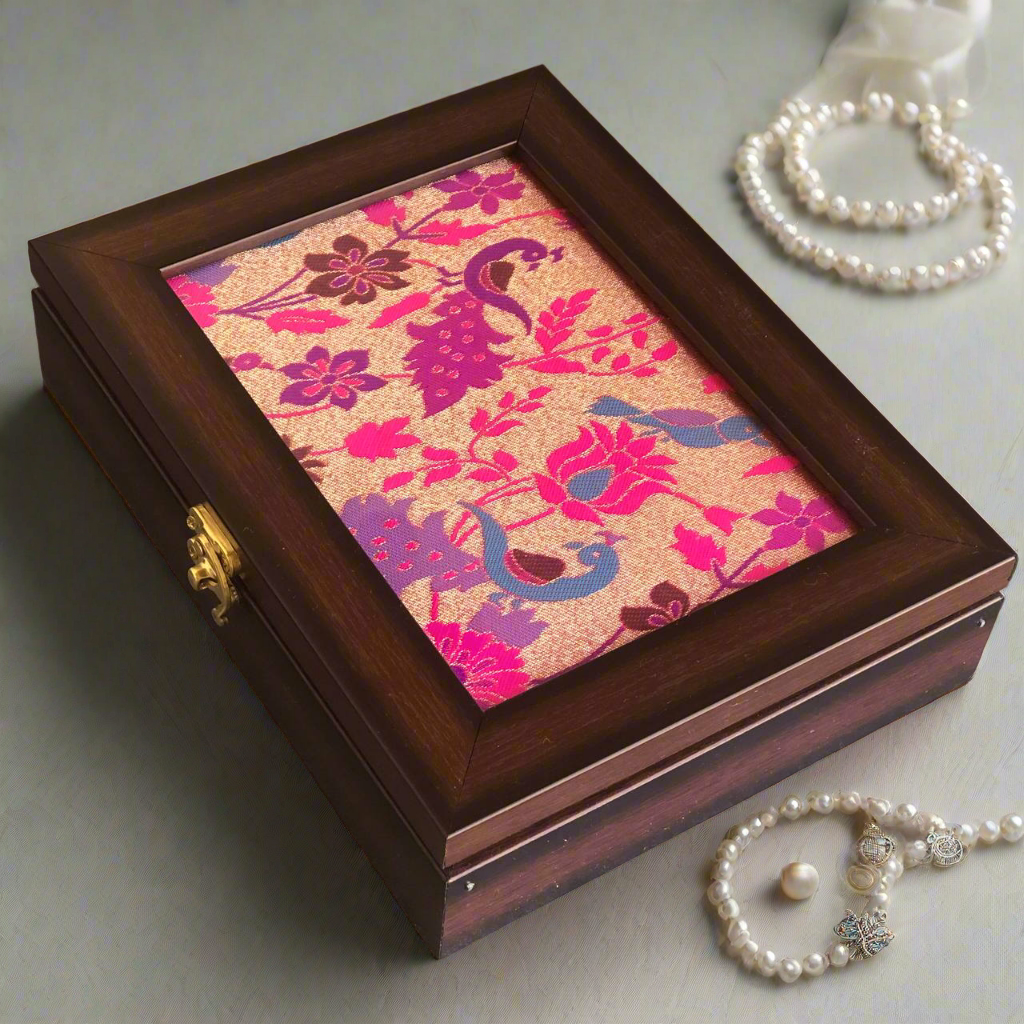 Celebrate the rich heritage of Maharashtra with this beautifully crafted Paithani jewellery box ๐. Adorned with authentic Paithani fabric featuring signature motifs like peacocks and lotuses ๐ฆ๐ธ, this box adds a regal touch to your dresser or gifting collection.